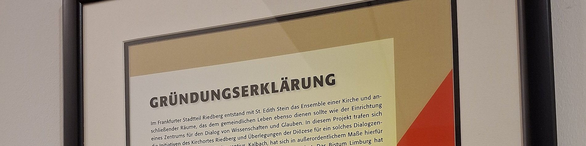 ʺWer die Wahrheit sucht, sucht Gott.ʺ Die heilige Edith Stein, im Kloster Schwester Theresia Benedicta a Cruce OCD, die ihr Leben im Konzentrationslager als Zeugin des Glaubens hingab, hat diesen Satz geprägt. Unter ihrem Bild begegnen sich Suchende und Fragende und Menschen, die Erfahrungen gemacht haben und sie mit anderen teilen wollen: Junge und Alte, Große und Kleine, Hiesige und Anderswoher-Kommende. Die Gründungserklärung wurde am 03. März 2021 durch das Kuratorium des Centre for Dialogue at Campus Riedberg verabschiedet.