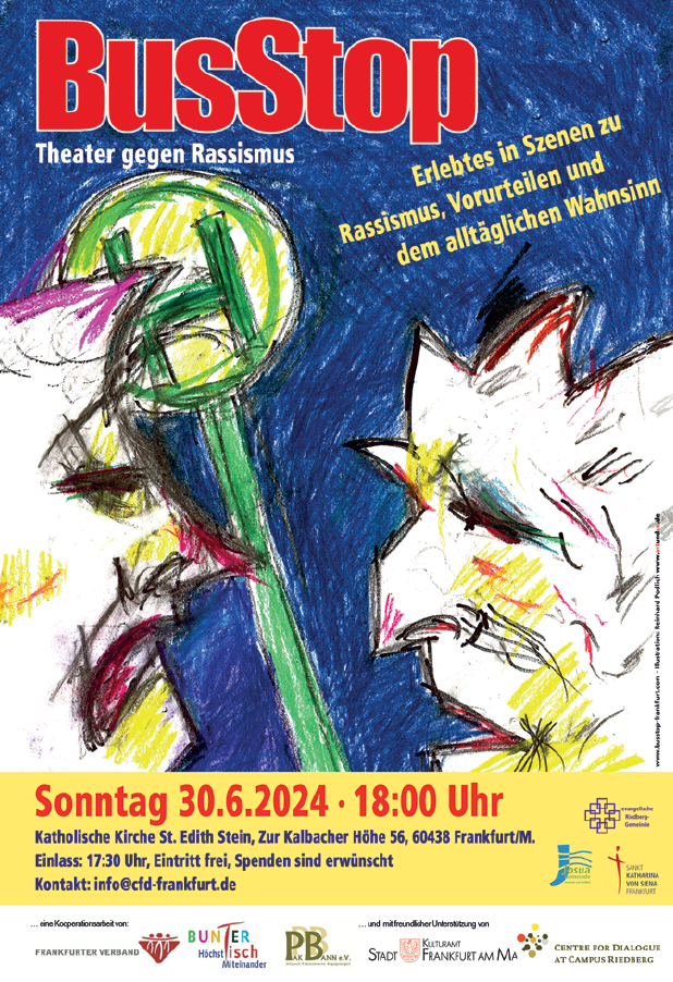 Das Theaterprojekt „BusStop - Theater gegen Rassismus“, das schon mit seinem ersten Stück seit 2016 große Anerkennung erfuhr, kommt mit seinem Bühnenrogramm ins Centre for Dialogue. In kurzen Szenen an einer Bushaltestelle werden Vorurteile und Rassismus im Alltag thematisiert, wie jede und jeder sie in täglichen Begegnungen erleben kann, auch bei sich selbst. Die derzeit 16 Schauspieler*innen sind eine bunt gemischte Gruppe, Menschen verschiedener Herkunft und unterschiedlichem kulturellen Hintergrund, die mit ihrem ehrenamtlichen Engagement ein Zeichen gegen Rassismus setzen. Ziel von BusStop ist es, zu einem guten Miteinander beizutragen. Das Publikum zum Nachdenken anzuregen und sie zu Offenheit, Aufmerksamkeit und respektvollem Dialog anstiften.